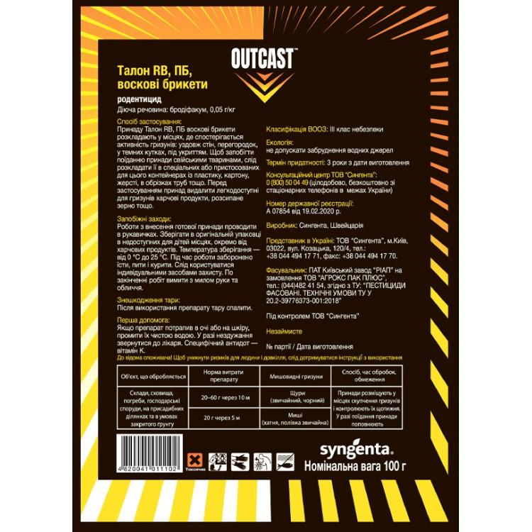 Талон™ воскові брикети виготовляються з тонкодисперсної основи з меленого високоякісного злакового зерна та відливаються у формах із рівномірним розподілом діючої речовини й приманки. Це забезпечує більшу довговічність порівняно зі звичайним пресуванням у формовані брикети, які зазвичай містять крупні частинки зерна. Привабливі для гризунів, високий рівень смакової привабливості заохочує споживати достатньо для знищення за один прийом їжі.Талон ™ воскові брикети ідеально підходять для закладання приманок у будівлях, складських приміщеннях, сховищах, а також в умовах підвищеної вологості, у т. ч. в каналізації. Центральний отвір у кожному брикеті дозволяє легко зафіксувати їх у місцях розміщення приманок і запобігає перенесенню їх гризунами.