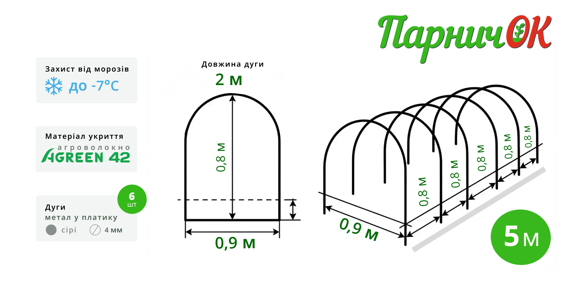 Міні-теплиця ПарничОК Agreen 5 м – це готовий міні-парник для захисту розсади, зелені та ранніх овочів від весняних заморозків, вітру та різких перепадів температури. Конструкція поєднує міцні металеві дуги та укривне агроволокно Agreen, яке фабрично пришите до каркаса.